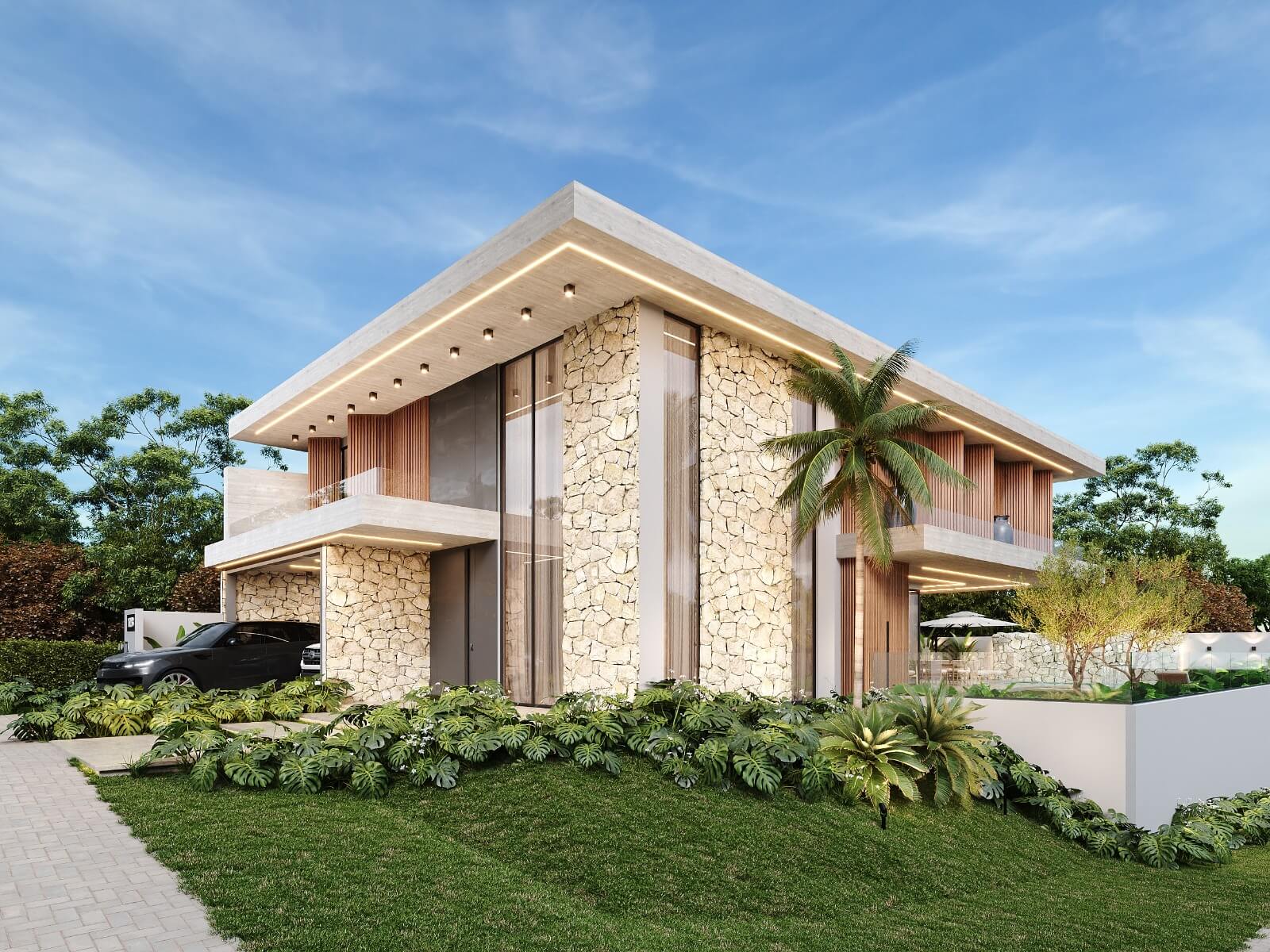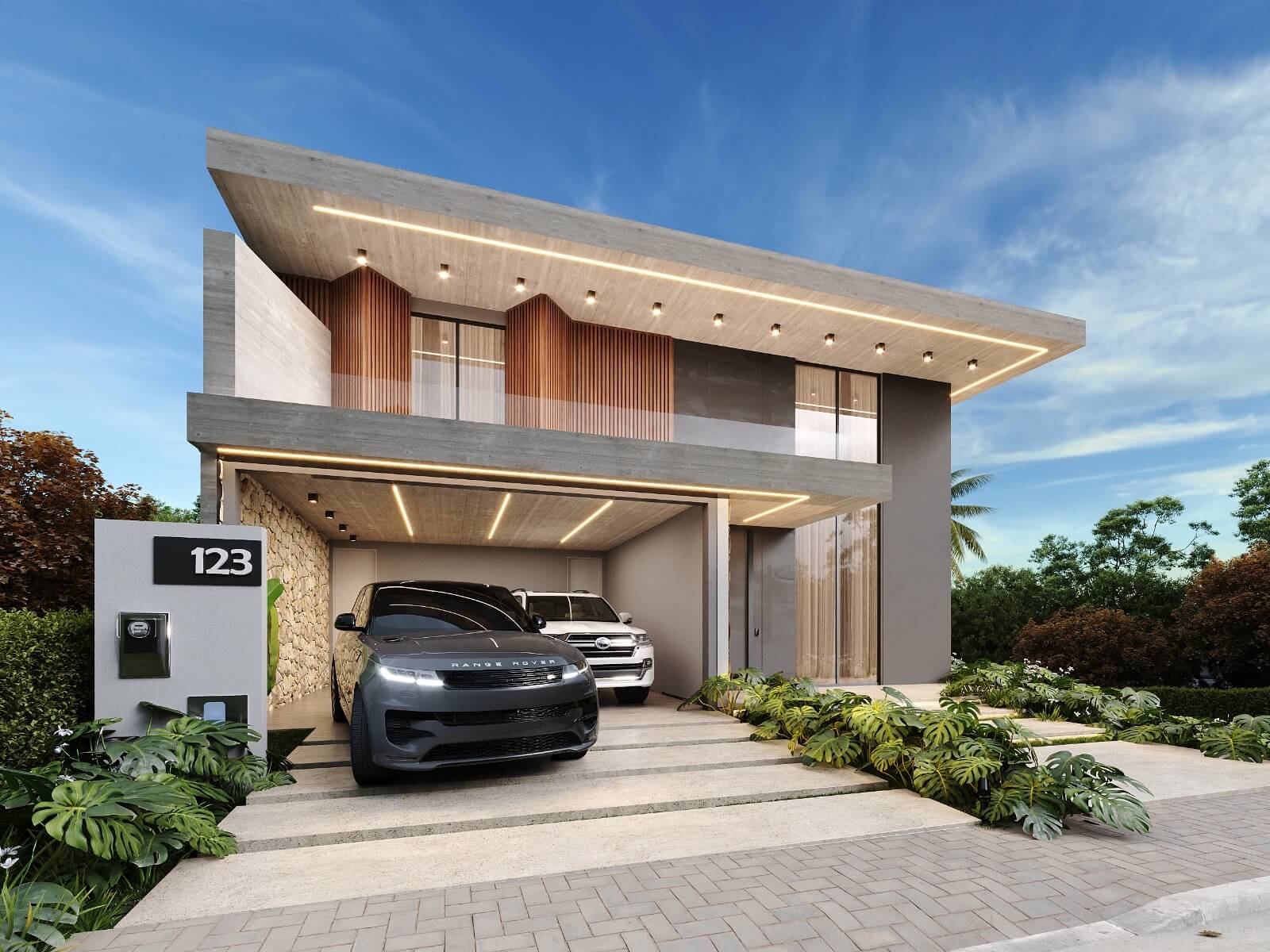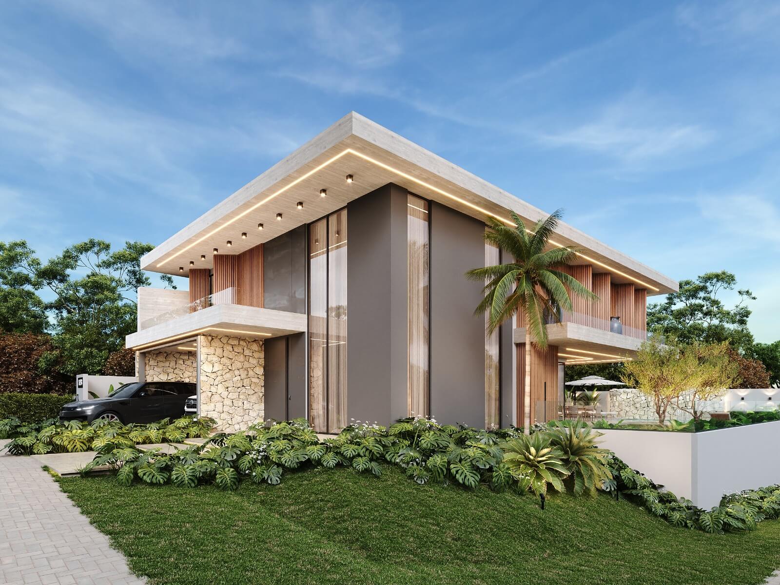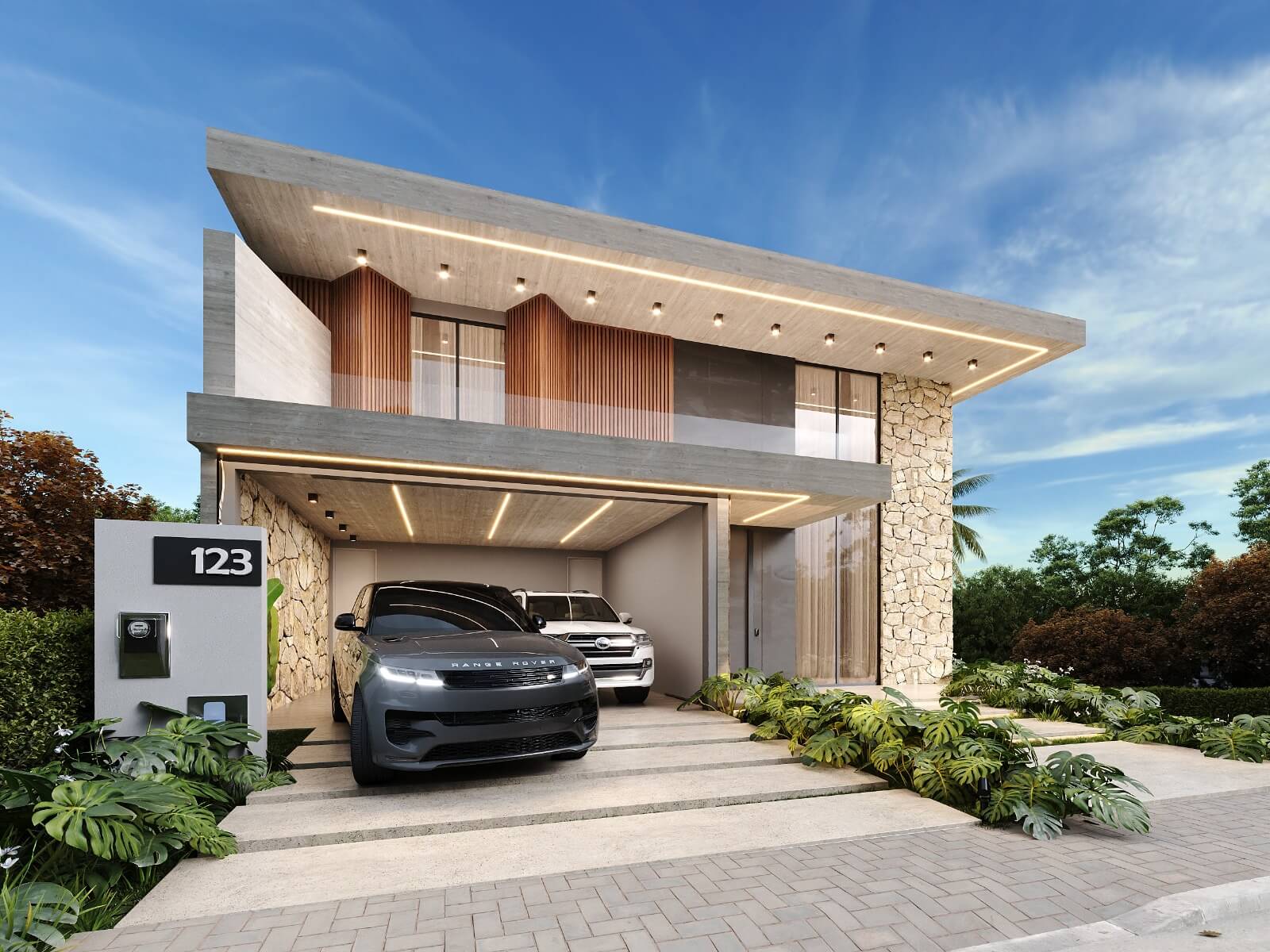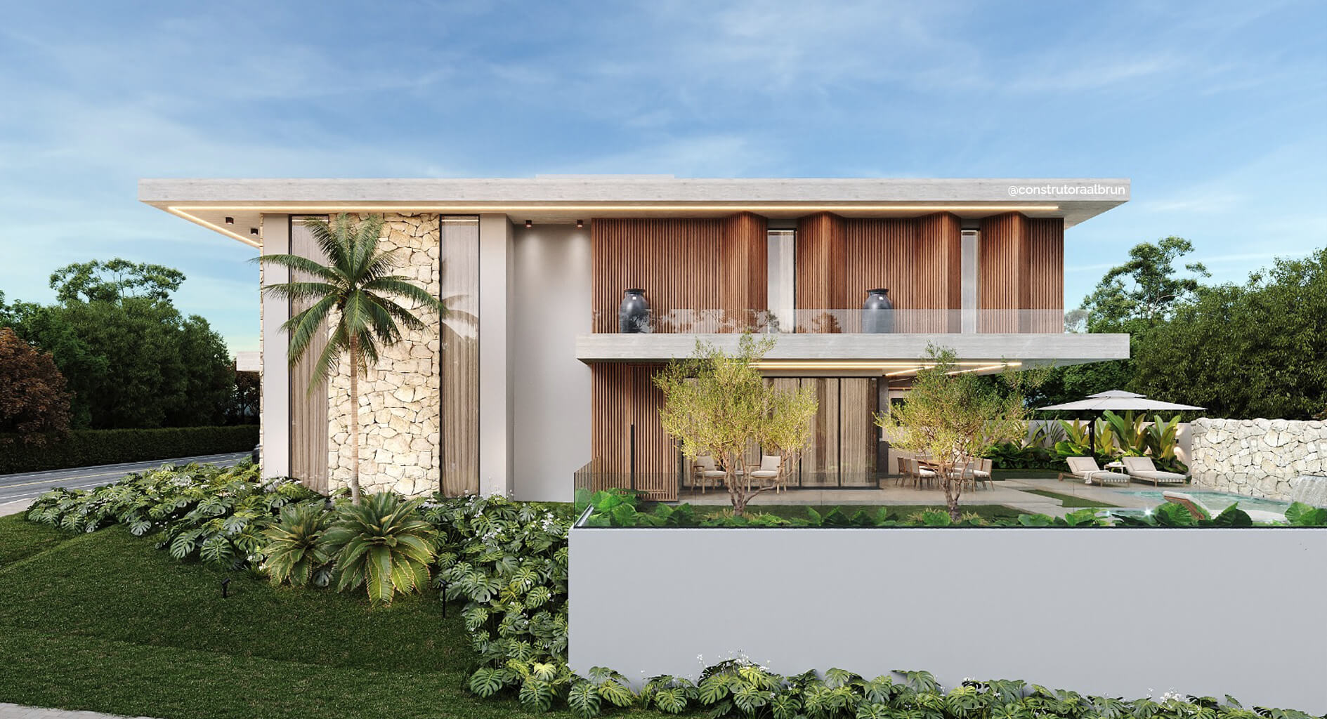 Residência com 2 pavimentos. Pavimento térreo com uma área social de pé direito duplo, dividida em hall de entrada, brinquedoteca sala de estar, jantar e cozinha gourmet na varanda. Despensa, lavanderia, lavabo, garagem para 02 carros. No pavimento superior temos 04 suítes com closet, varandas e mezanino.