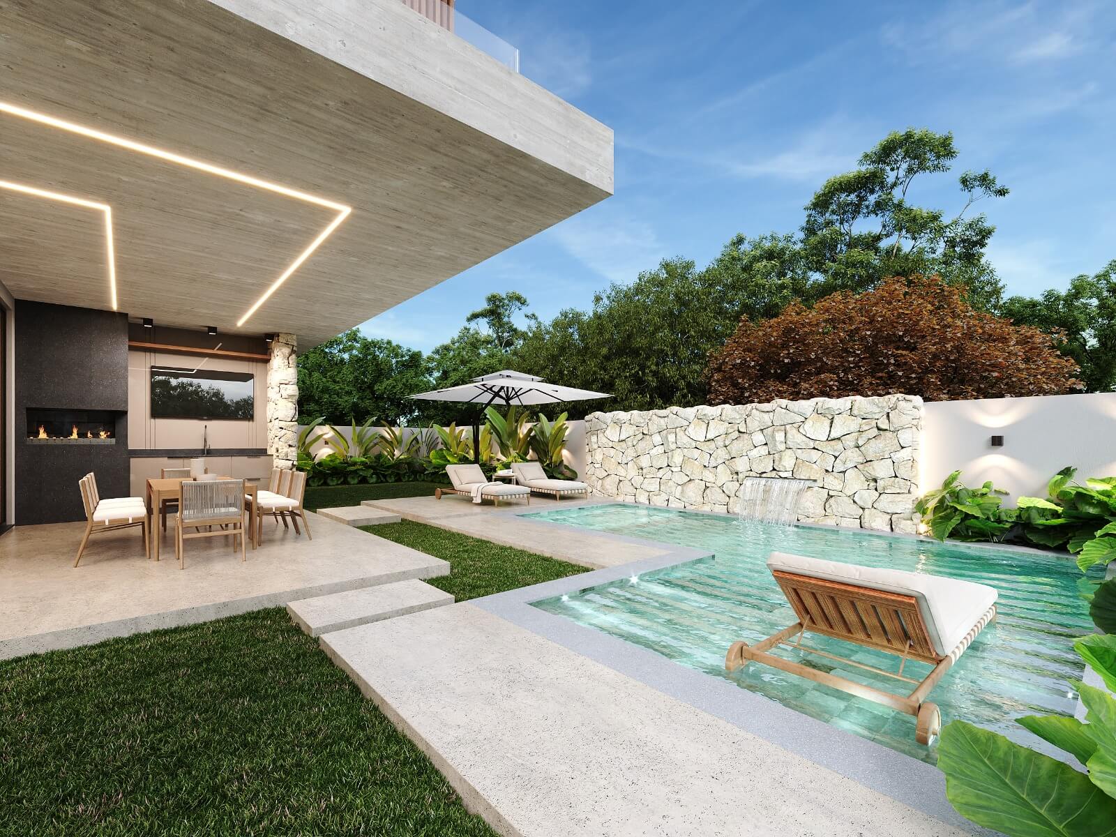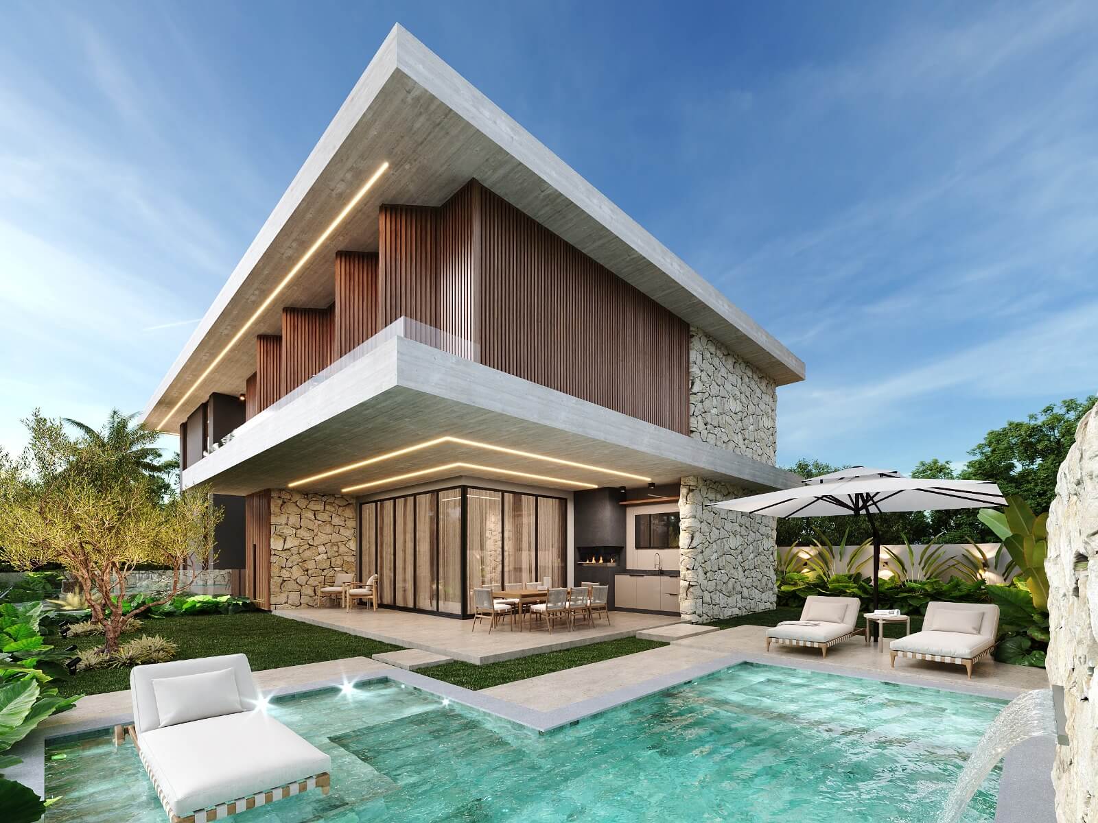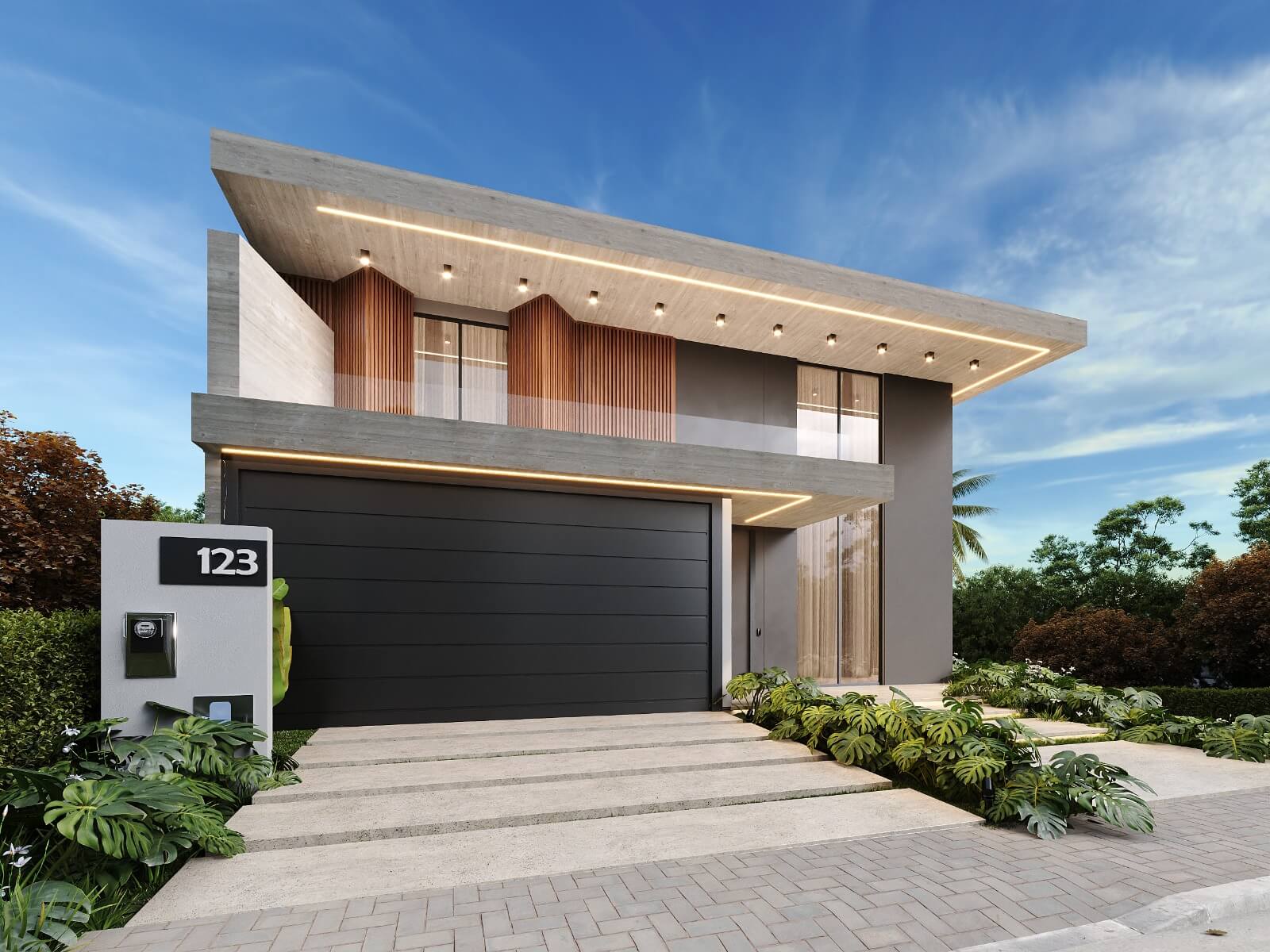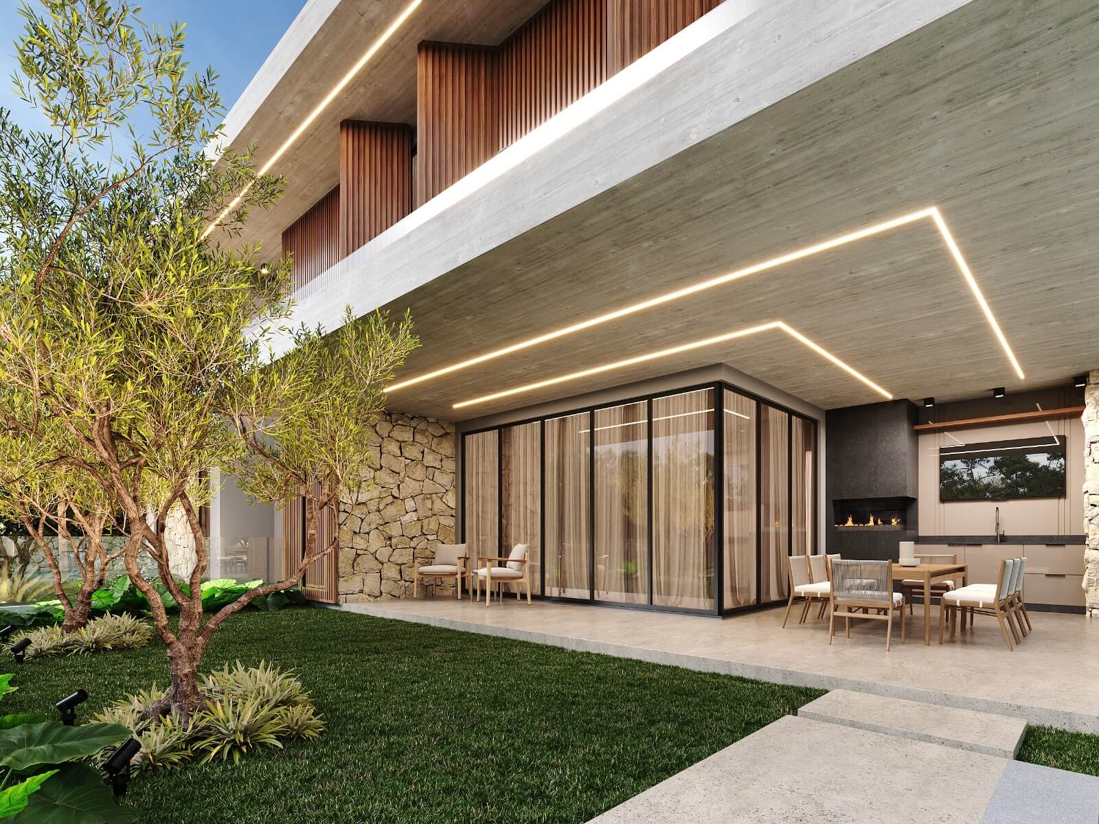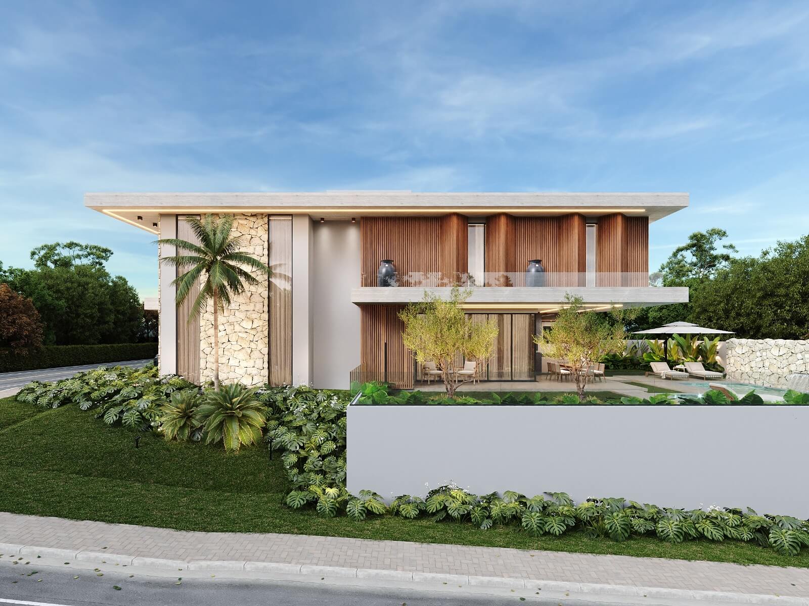 Residência com 2 pavimentos. Pavimento térreo com uma área social de pé direito duplo, dividida em hall de entrada, brinquedoteca sala de estar, jantar e cozinha gourmet na varanda. Despensa, lavanderia, lavabo, garagem para 02 carros. No pavimento superior temos 04 suítes com closet, varandas e mezanino.